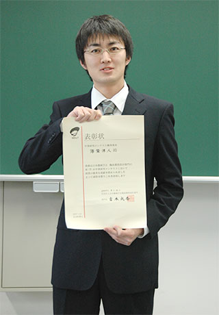 2009年9月14日に岩手大学にて開催された日本機械学会2009年度年次大会,機素潤滑設計部門卒業研究コンテストにおいて修士1年の薄葉洋人君が「弾性表面波モータの長寿命化のための駆動面設計に関する研究」を発表し,優秀賞を受賞しました.